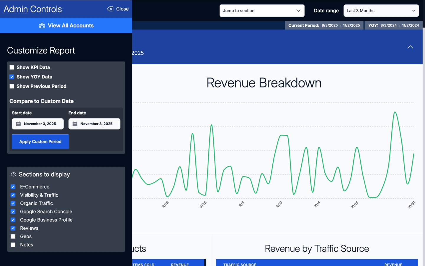 - Activate Year-over-Year, Previous Period, or Custom Date Range comparisons to evaluate performance trends over time.